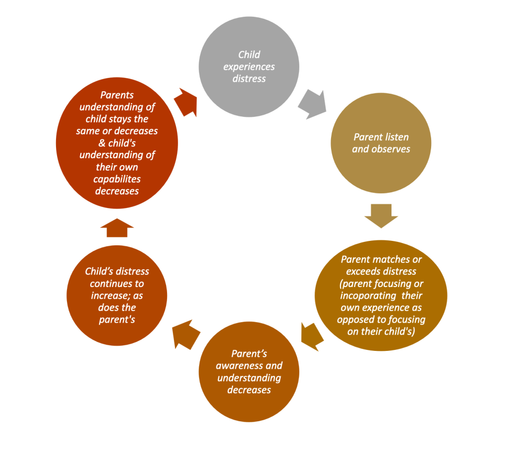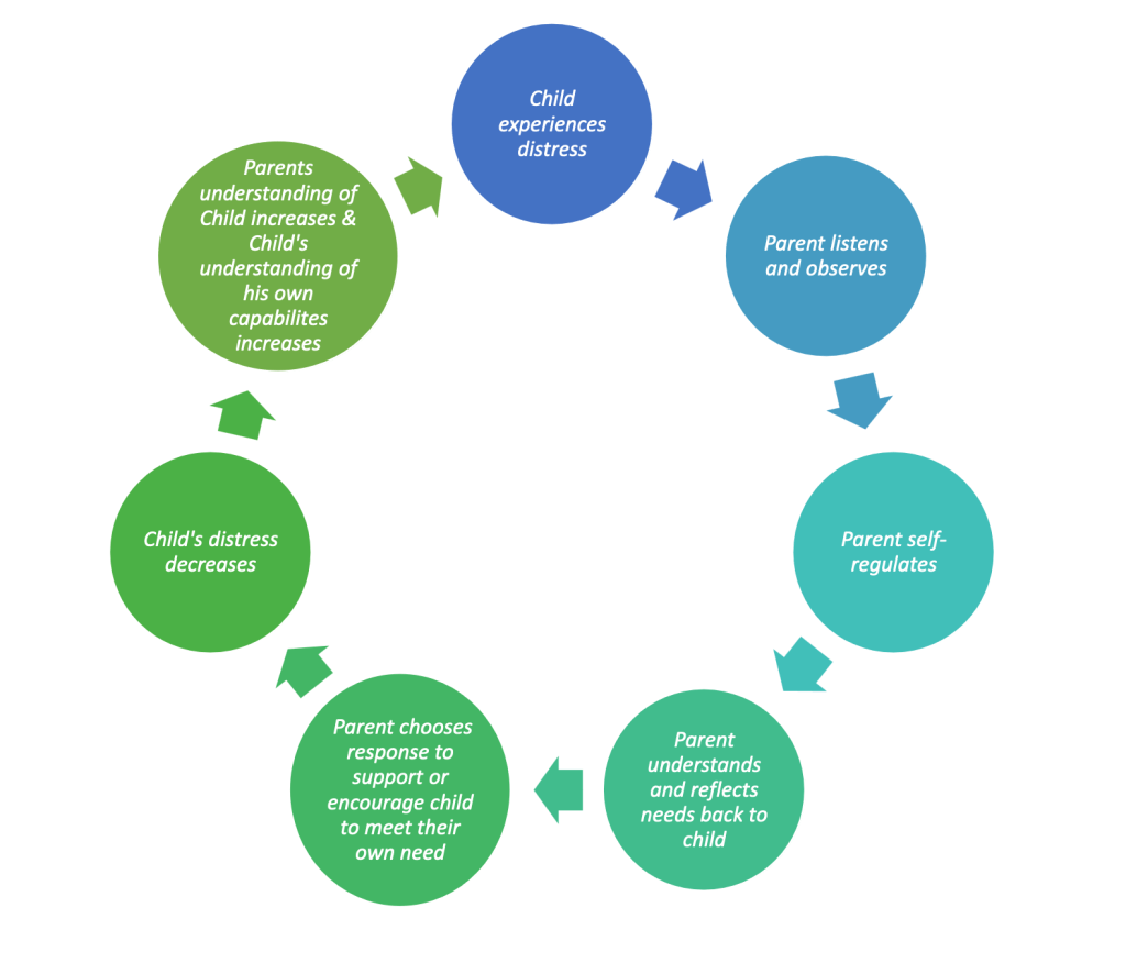 The two diagrams have similar components. In both scenarios the parent notices the distress of the child, however in the effective model of attunement, the parent is able to regulate themselves, prior to engaging with the distressed child. This is called co-regulation. This process consists of you helping your child learn to regulate themself (thoughts, feelings, and behaviors) by doing it alongside your child. Using the detailed knowledge you have of your child, you are developing a deeper understanding of them and consciously choosing your own emotions, words, and actions to support their regulation.