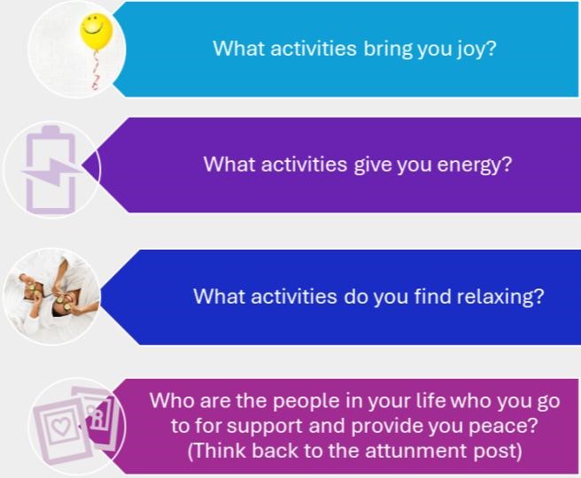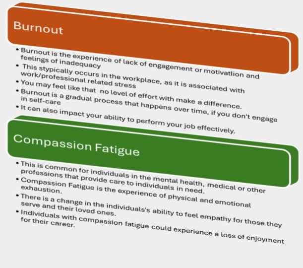 - If we don’t participate in self-care we run the risk of burnout (can impact work performance) and compassion fatigue (can impact our ability demonstrate empathy).