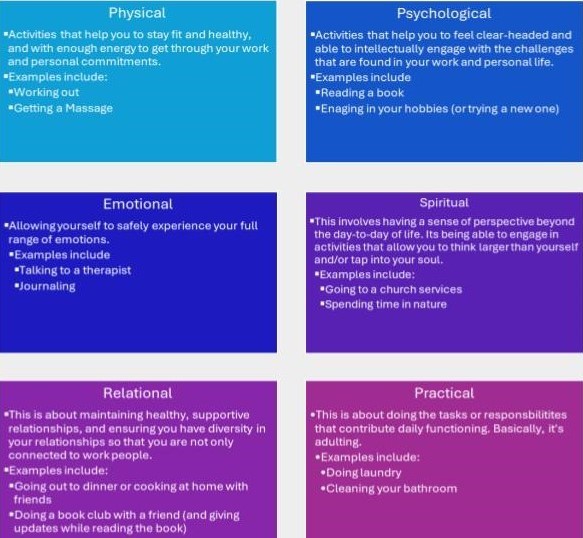 - We explored 6 forms of self-care (more to come on these in the future):